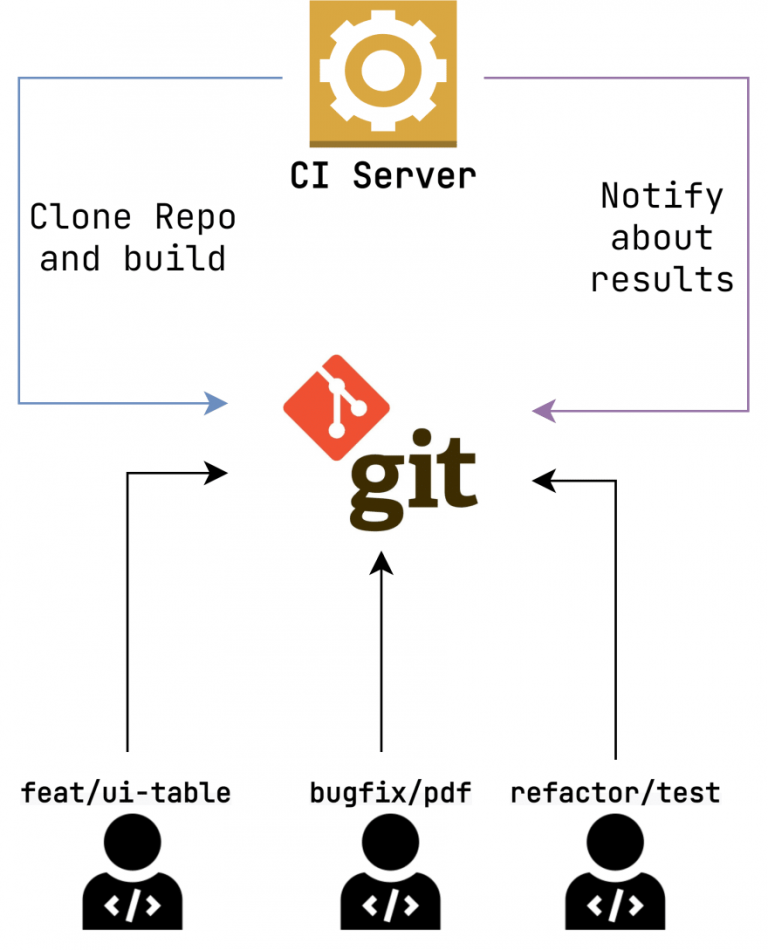 Sau khi các developer code xong, họ sẻ đẩy lên server lưu trử (Git), mỗi developer sẻ có một nhánh riêng, server CI sẻ lắng nghe những yêu cầu đẩy code của developer, sau đó server CI sẻ kéo code về tử server lưu trử (Git) tiến hành kiểm tra code, sau đó báo về cho developer, tuỳ vào yêu cầu của dự án mà code có được merge (hợp nhất, tương tự như lắp ráp các linh kiện oto) vào master (nhánh chín, có hể hiểu nôm na là chiếc oto đang dần hoàn thiện) hay không.